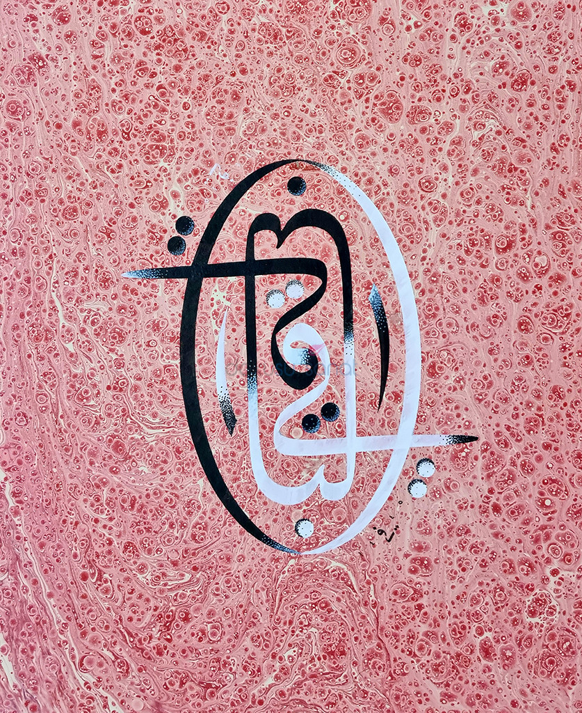 Hüsn-i Hat Tablo. Müsenna formda, celi sülüs hat sanatı eseri. El Baki c.c. ism-i şerifi yazılı olan eserde harf birleşim yerleri noktalama tekniği ile gölgelendirilip yumuşatılmıştır. Ebrulu ve aharlı kağıda yazılmış olan eser, çerçeveli ve murakkalıdır.