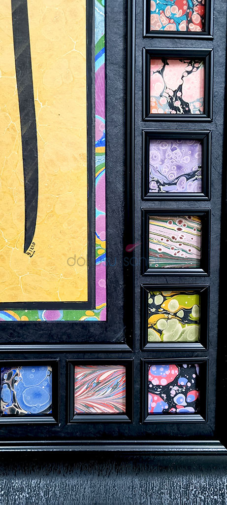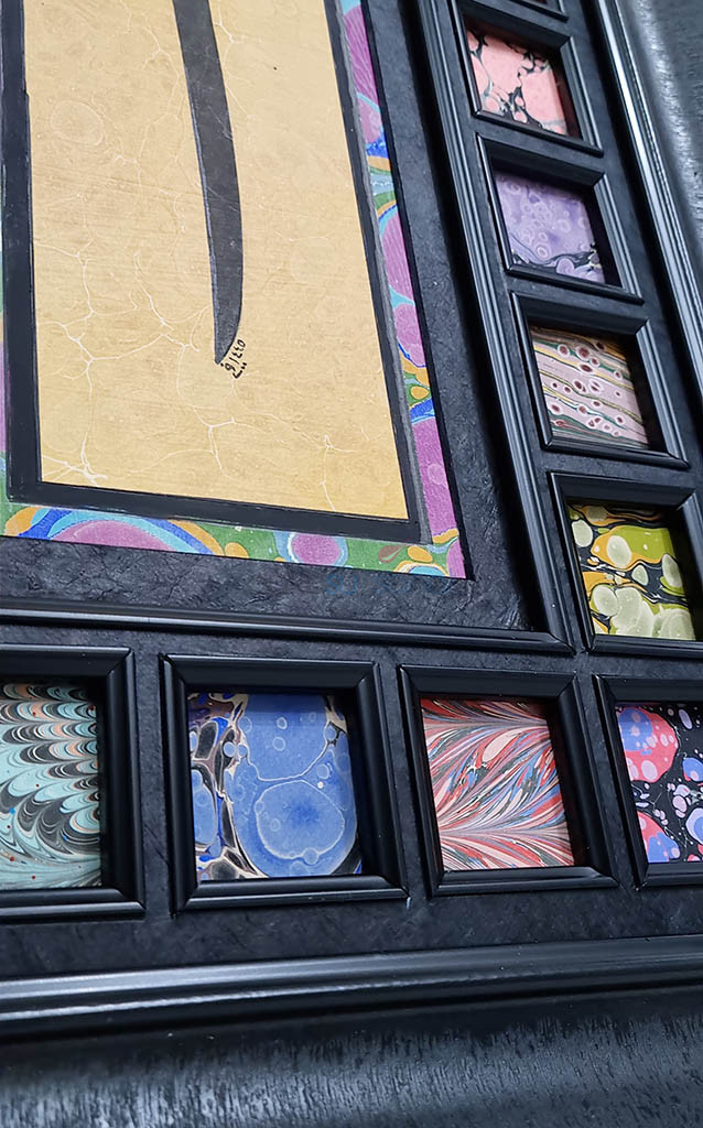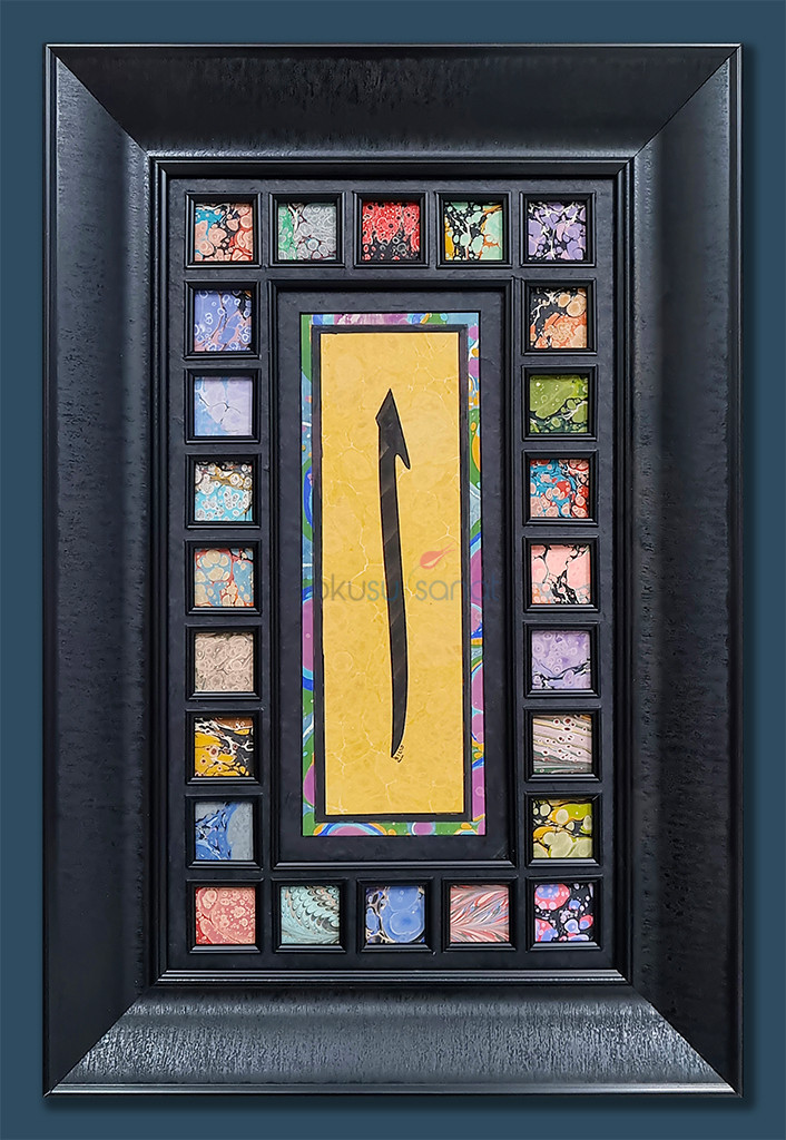 Açıklama : Sarı bir ebrulu aharlı kağıt üzerine yazılmış celi sülüs Elif hattı ve ebru süslemeleri. Elif harfinin merkezde olduğu bu orijinal hat tablosunun etrafı 24 farklı ebru ile süslenmiştir. her ebrunun etrafını saran slipler ebru ve elif hattını uyumlu bir biçimde bütünler. Tasarım ve fikir olarak Fatih Yeşil’e ait bu eser klasik unsurların modern birlikteliğidir.