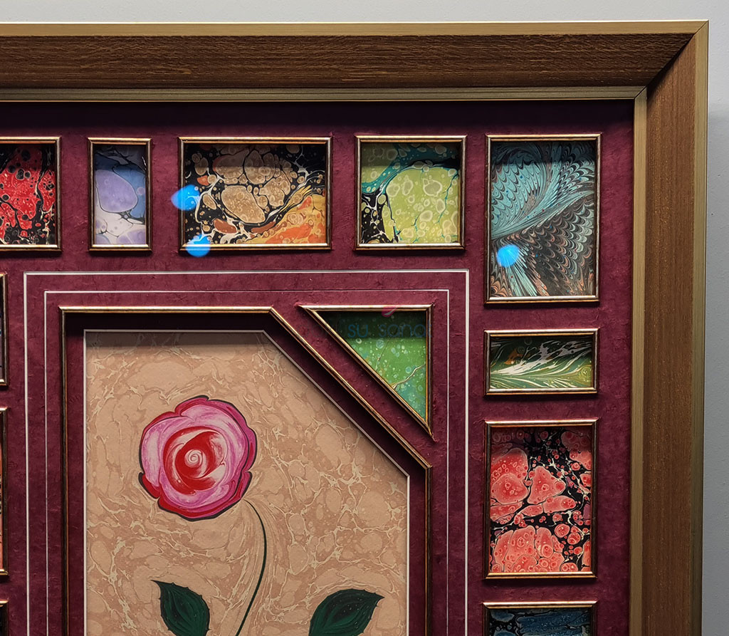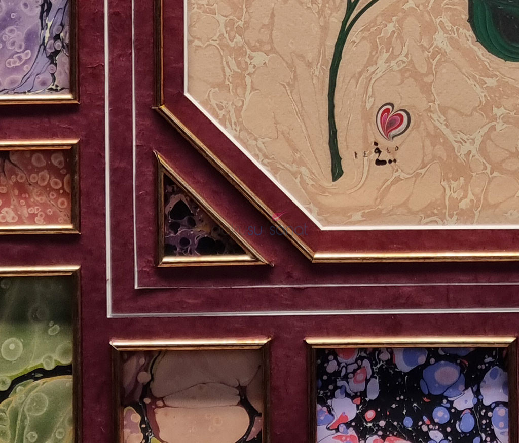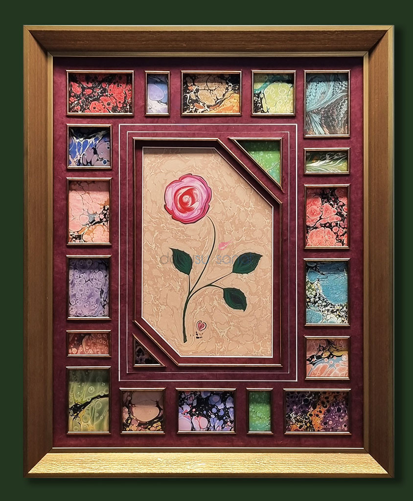 Açıklama : Kırmızı beyaz renklerin ağırlıkta olduğu bir gül ebru tablosu. Gül’ün etrafı daha önce görülmemiş bir biçimde, 20 farklı ebru kullanılarak süslenmiştir. Kare, dikdörtgen ve üçgen biçiminde kullanılan ebruların her birinin etrafı sliple çevrilmiştir.