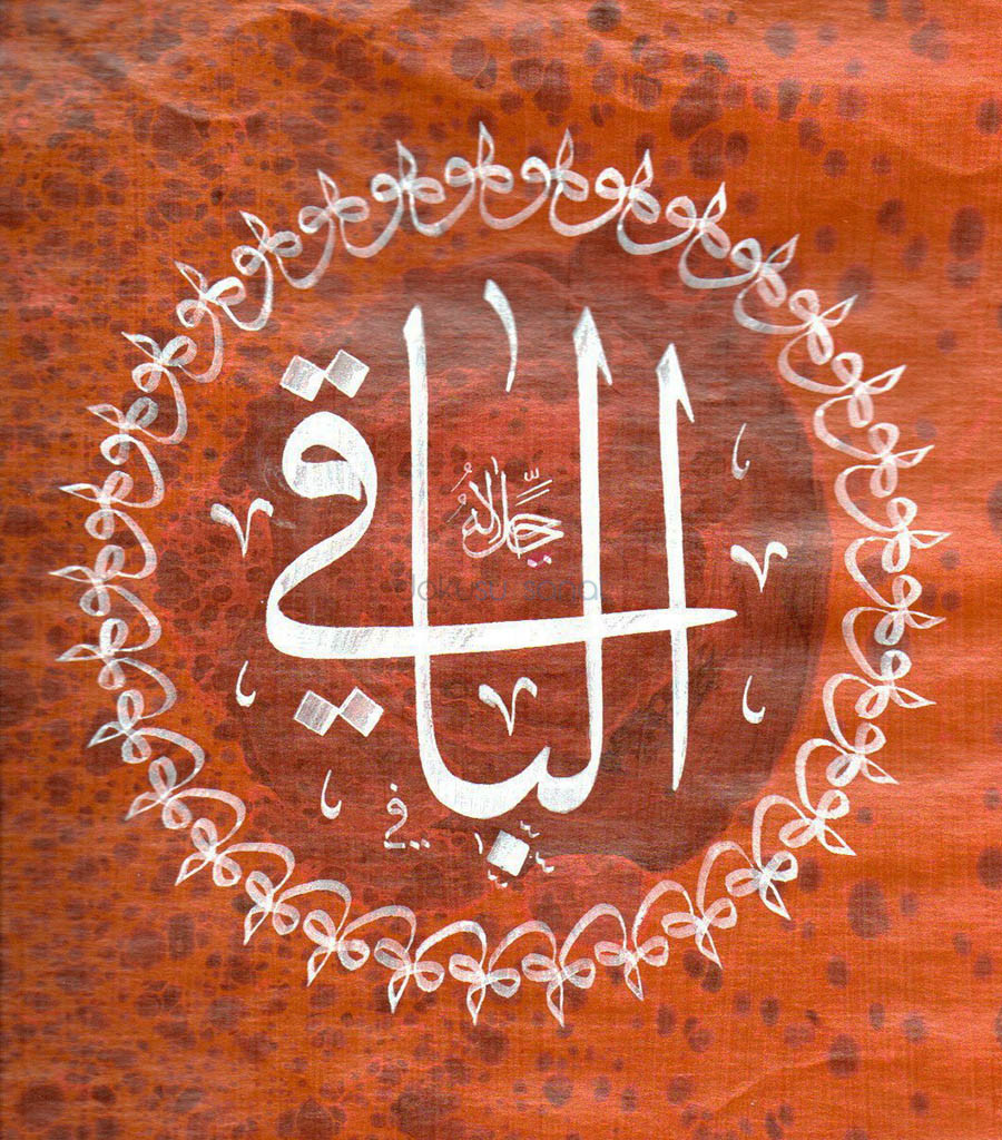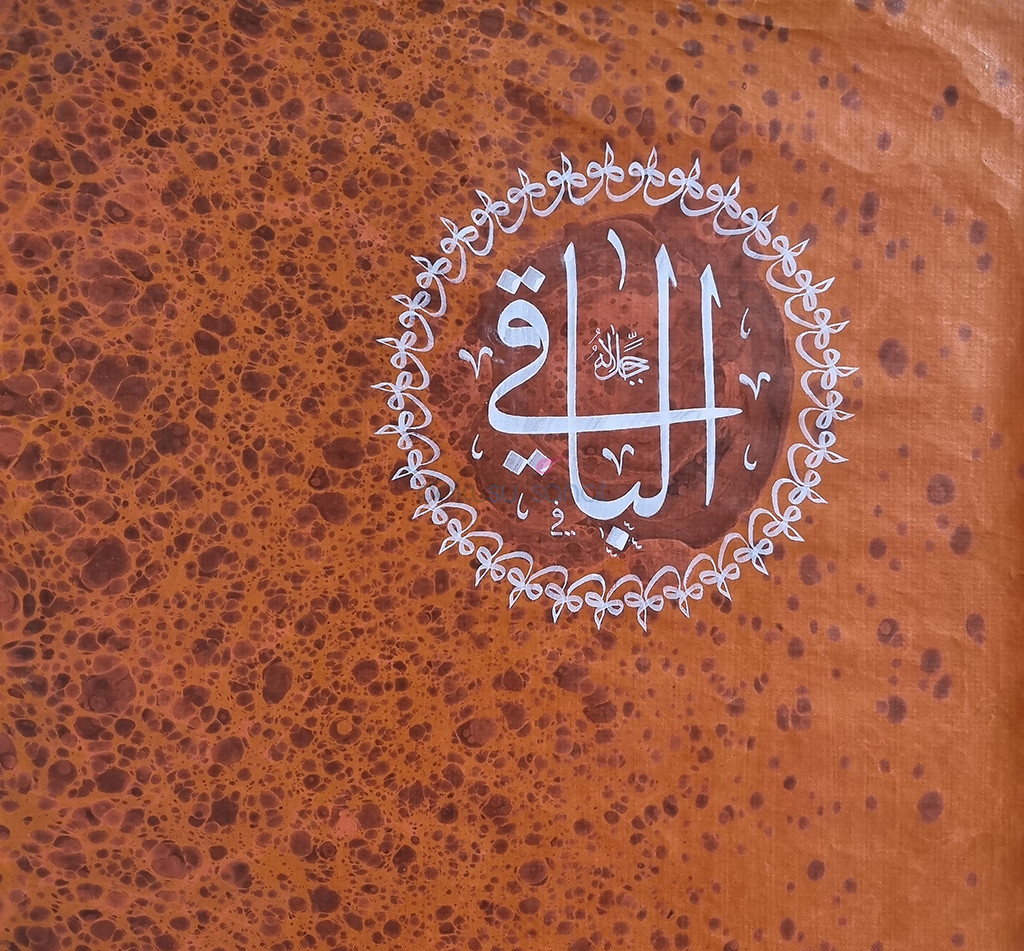 Açıklama : Aharlı ebru kağıdı üzerine beyaz mürekkeple yazılmış 33 Hu ve El Baki ismi şerifi. Esma-ül Hüsna dan biri olan sülüs istif kağıda asimetrik olarak yerleştirilmiş olduğundan farklı tezhip süslemesi yapmak isteyenler için uygun olabilir.