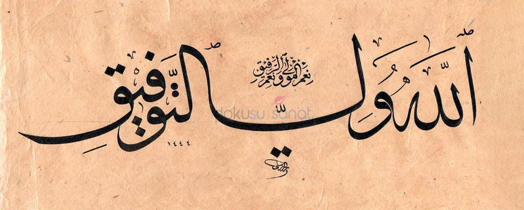 Açıklama : Aharlı kağıt üzerine siyah mürekkeple yazılmış Allahü veliyyüt-tevfîk Ni-mel Mevla ve Ni-mel-Refik. ibaresi. Eser celi sülüs ve icaze hattı olarak meşk edilmiştir.